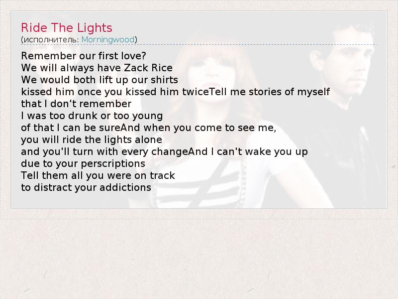 Remember our first love? We will always have Zack Rice We would both lift up our shirts kissed him once you kissed him twiceTell me stories of myself that I don't remember I was too drunk or too young of that I can be sureAnd when you come to see me, you will ride the lights alone and you'll turn with every changeAnd I can't wake you up due to your perscriptions Tell them all you were on track to distract your addictions