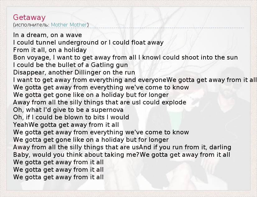 Это интересно:Группа Mother Mother начиналась как семейное дело. Гитарист и певец Райан Галдемонд писал песни и хотел исполнять их в местных клубах. Но почувствовав, что не хватает полноты звука для общей гармонии, он пригласил свою сестру Молли. А Молли, в свою очередь, позвала свою подругу Дебру-Джин Крилман, и таким образом группа зазвучала в трио, завоевав огромный успех у публики.... продолжение