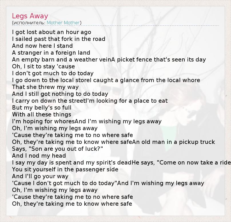 I got lost about an hour ago I sailed past that fork in the road And now here I stand A stranger in a foreign land An empty barn and a weather veinA picket fence that's seen its day Oh, I sit to stay 'cause I don't got much to do today I go down to the local storeI caught a glance from the local whore That she threw my way And I still got nothing to do today I carry on down the streetI'm looking for a place to eat But my belly's so full With all these things I'm hoping for whoresAnd I'm wishing my legs away Oh, I'm wishing my legs away 'Cause they're taking me to no where safe Oh, they're taking me to know where safeAn old man in a pickup truck Says, "Son are you out of luck?" And I nod my head I say my day is spent and my spirit's deadHe says, "Come on now take a ride You sit yourself in the passenger side And I'll go your way 'Cause I don't got much to do today"And I'm wishing my legs away Oh, I'm wishing my legs away 'Cause they're taking me to no where safe Oh, they're taking me to know where safe