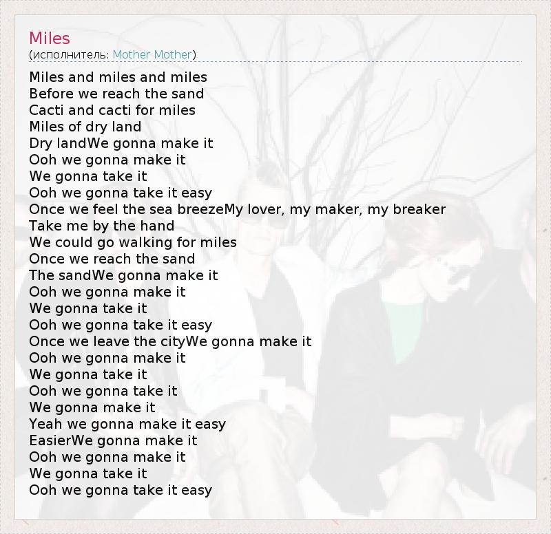 Это интересно:Группа Mother Mother начиналась как семейное дело. Гитарист и певец Райан Галдемонд писал песни и хотел исполнять их в местных клубах. Но почувствовав, что не хватает полноты звука для общей гармонии, он пригласил свою сестру Молли. А Молли, в свою очередь, позвала свою подругу Дебру-Джин Крилман, и таким образом группа зазвучала в трио, завоевав огромный успех у публики.... продолжение