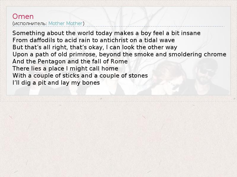 Это интересно:Группа Mother Mother начиналась как семейное дело. Гитарист и певец Райан Галдемонд писал песни и хотел исполнять их в местных клубах. Но почувствовав, что не хватает полноты звука для общей гармонии, он пригласил свою сестру Молли. А Молли, в свою очередь, позвала свою подругу Дебру-Джин Крилман, и таким образом группа зазвучала в трио, завоевав огромный успех у публики.... продолжение