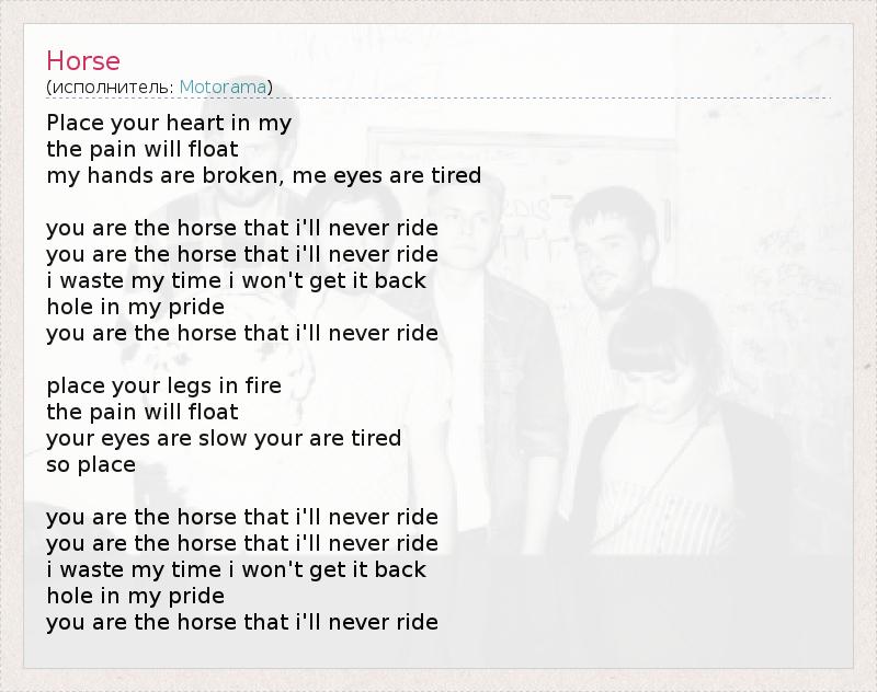 Place your heart in my the pain will float my hands are broken, me eyes are tired you are the horse that i'll never ride you are the horse that i'll never ride i waste my time i won't get it back hole in my pride you are the horse that i'll never ride place your legs in fire the pain will float your eyes are slow your are tired so place you are the horse that i'll never ride you are the horse that i'll never ride i waste my time i won't get it back hole in my pride you are the horse that i'll never ride