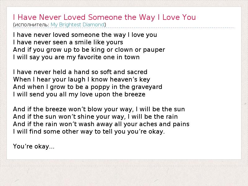 А как ты думаешь, о чем песня "I Have Never Loved Someone the Way I Love You" ?