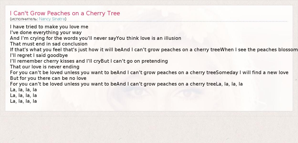 ГлавнаяИсполнителиNancy SinatraI Can't Grow Peaches on a Cherry Tree