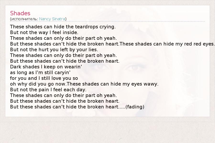 But these shades can't hide the broken heart.These shades can hide my red red eyes.