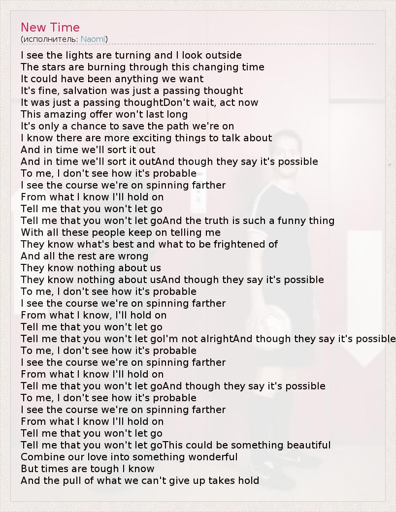 I see the lights are turning and I look outside The stars are burning through this changing time It could have been anything we want It's fine, salvation was just a passing thought It was just a passing thoughtDon't wait, act now This amazing offer won't last long It's only a chance to save the path we're on I know there are more exciting things to talk about And in time we'll sort it out And in time we'll sort it outAnd though they say it's possible To me, I don't see how it's probable I see the course we're on spinning farther From what I know I'll hold on Tell me that you won't let go Tell me that you won't let goAnd the truth is such a funny thing With all these people keep on telling me They know what's best and what to be frightened of And all the rest are wrong They know nothing about us They know nothing about usAnd though they say it's possible To me, I don't see how it's probable I see the course we're on spinning farther From what I know, I'll hold on Tell me that you won't let go Tell me that you won't let goI'm not alrightAnd though they say it's possible To me, I don't see how it's probable I see the course we're on spinning farther From what I know I'll hold on Tell me that you won't let goAnd though they say it's possible To me, I don't see how it's probable I see the course we're on spinning farther From what I know I'll hold on Tell me that you won't let go Tell me that you won't let goThis could be something beautiful Combine our love into something wonderful But times are tough I know And the pull of what we can't give up takes hold