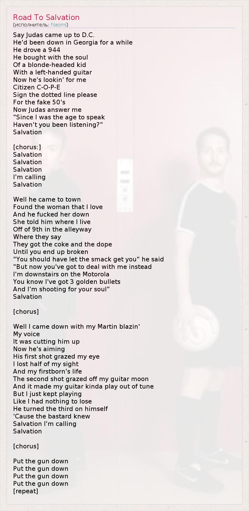Скажем, Иуда явился из округа Колумбия, Какое-то время был в Джорджии, Уехал на Porsche 944, Он купил с потрохами Светловолосого парня С гитарой для левши, А теперь он ищет меня - Citizen COPE, Распишитесь вот здесь, пожалуйста, Липовые 50-е года, Но вот Иуда отвечает мне: "Когда я только научился говорить, Неужели ты не слышал моих слов?" Спасение [Припев:] Спасение Спасение Спасение Спасение Что ж, он пришел в город, Нашел женщину, которую я люблю, И трахнул ее, Она рассказала ему, где я живу, В переулке, рядом с девятой, Где, как говорят, Берут кокс и прочую наркоту, Пока в конечном счете не остаются на мели. "Ты должен был принять герыч", сказал он, "Но вместо этого будешь иметь дело со мной, Я внизу, болтаю по мобильнику, Ты знаешь, у меня есть три золотых пули, И я собираюсь их всадить в твою душу" Спасение [Припев] Что ж, я вылез из сияющего Aston Martin, Мой голос Причинял ему боль, А теперь он наставляет на меня пушку, Первым же выстрелом он попал мне в глаз, Я упустил его из виду, И потерял своего ребенка, Вторым выстрелом он сбил мою лунную гитару, И она потеряла свое звучание, Но просто продолжал бренчать, Словно мне было нечего терять, На третий раз он наставил пистолет на себя, Потому что ублюдок знал, Я молю о спасении, Спасении [Припев] Сложи оружие Сложи оружие Сложи оружие Сложи оружие