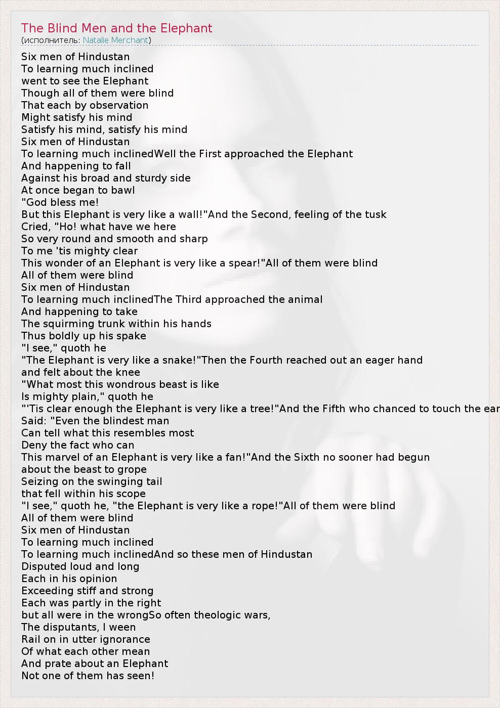 Six men of Hindustan To learning much inclined went to see the Elephant Though all of them were blind That each by observation Might satisfy his mind Satisfy his mind, satisfy his mind Six men of Hindustan To learning much inclinedWell the First approached the Elephant And happening to fall Against his broad and sturdy side At once began to bawl "God bless me! But this Elephant is very like a wall!"And the Second, feeling of the tusk Cried, "Ho! what have we here So very round and smooth and sharp To me 'tis mighty clear This wonder of an Elephant is very like a spear!"All of them were blind All of them were blind Six men of Hindustan To learning much inclinedThe Third approached the animal And happening to take The squirming trunk within his hands Thus boldly up his spake "I see," quoth he "The Elephant is very like a snake!"Then the Fourth reached out an eager hand and felt about the knee "What most this wondrous beast is like Is mighty plain," quoth he "'Tis clear enough the Elephant is very like a tree!"And the Fifth who chanced to touch the ear Said: "Even the blindest man Can tell what this resembles most Deny the fact who can This marvel of an Elephant is very like a fan!"And the Sixth no sooner had begun about the beast to grope Seizing on the swinging tail that fell within his scope "I see," quoth he, "the Elephant is very like a rope!"All of them were blind All of them were blind Six men of Hindustan To learning much inclined To learning much inclinedAnd so these men of Hindustan Disputed loud and long Each in his opinion Exceeding stiff and strong Each was partly in the right but all were in the wrongSo often theologic wars, The disputants, I ween Rail on in utter ignorance Of what each other mean And prate about an Elephant Not one of them has seen!