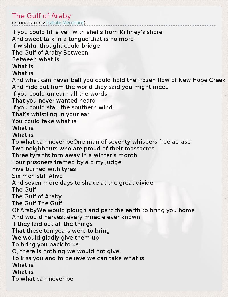 If you could fill a veil with shells from Killiney's shore And sweet talk in a tongue that is no more If wishful thought could bridge The Gulf of Araby Between Between what is What is What is And what can never beIf you could hold the frozen flow of New Hope Creek And hide out from the world they said you might meet If you could unlearn all the words That you never wanted heard If you could stall the southern wind That's whistling in your ear You could take what is What is What is To what can never beOne man of seventy whispers free at last Two neighbours who are proud of their massacres Three tyrants torn away in a winter's month Four prisoners framed by a dirty judge Five burned with tyres Six men still Alive And seven more days to shake at the great divide The Gulf The Gulf of Araby The Gulf The Gulf Of ArabyWe would plough and part the earth to bring you home And would harvest every miracle ever known If they laid out all the things That these ten years were to bring We would gladly give them up To bring you back to us O, there is nothing we would not give To kiss you and to believe we can take what is What is What is To what can never be