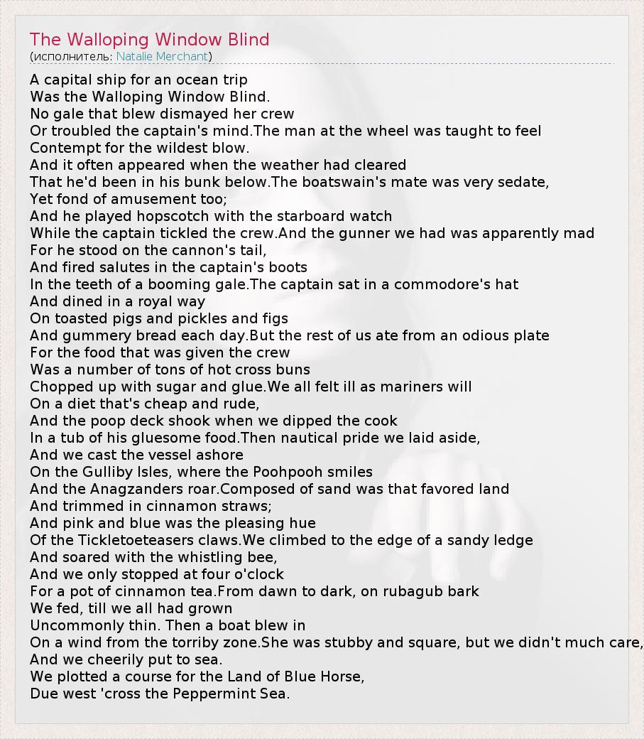 A capital ship for an ocean trip Was the Walloping Window Blind. No gale that blew dismayed her crew Or troubled the captain's mind.The man at the wheel was taught to feel Contempt for the wildest blow. And it often appeared when the weather had cleared That he'd been in his bunk below.The boatswain's mate was very sedate, Yet fond of amusement too; And he played hopscotch with the starboard watch While the captain tickled the crew.And the gunner we had was apparently mad For he stood on the cannon's tail, And fired salutes in the captain's boots In the teeth of a booming gale.The captain sat in a commodore's hat And dined in a royal way On toasted pigs and pickles and figs And gummery bread each day.But the rest of us ate from an odious plate For the food that was given the crew Was a number of tons of hot cross buns Chopped up with sugar and glue.We all felt ill as mariners will On a diet that's cheap and rude, And the poop deck shook when we dipped the cook In a tub of his gluesome food.Then nautical pride we laid aside, And we cast the vessel ashore On the Gulliby Isles, where the Poohpooh smiles And the Anagzanders roar.Composed of sand was that favored land And trimmed in cinnamon straws; And pink and blue was the pleasing hue Of the Tickletoeteasers claws.We climbed to the edge of a sandy ledge And soared with the whistling bee, And we only stopped at four o'clock For a pot of cinnamon tea.From dawn to dark, on rubagub bark We fed, till we all had grown Uncommonly thin. Then a boat blew in On a wind from the torriby zone.She was stubby and square, but we didn't much care, And we cheerily put to sea. We plotted a course for the Land of Blue Horse, Due west 'cross the Peppermint Sea.