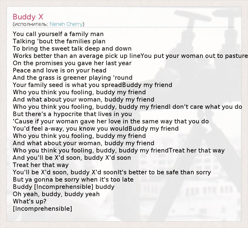 Who you think you fooling, buddy, buddy my friendTreat her that way