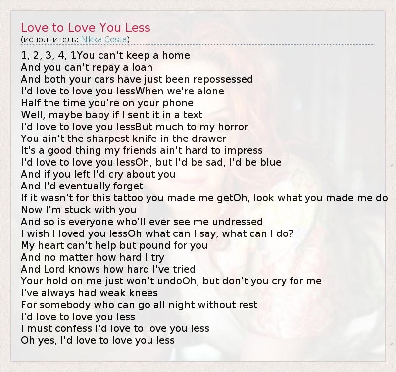 1, 2, 3, 4, 1You can't keep a home And you can't repay a loan And both your cars have just been repossessed I'd love to love you lessWhen we're alone Half the time you're on your phone Well, maybe baby if I sent it in a text I'd love to love you lessBut much to my horror You ain't the sharpest knife in the drawer It's a good thing my friends ain't hard to impress I'd love to love you lessOh, but I'd be sad, I'd be blue And if you left I'd cry about you And I'd eventually forget If it wasn't for this tattoo you made me getOh, look what you made me do Now I'm stuck with you And so is everyone who'll ever see me undressed I wish I loved you lessOh what can I say, what can I do? My heart can't help but pound for you And no matter how hard I try And Lord knows how hard I've tried Your hold on me just won't undoOh, but don't you cry for me I've always had weak knees For somebody who can go all night without rest I'd love to love you less I must confess I'd love to love you less Oh yes, I'd love to love you less