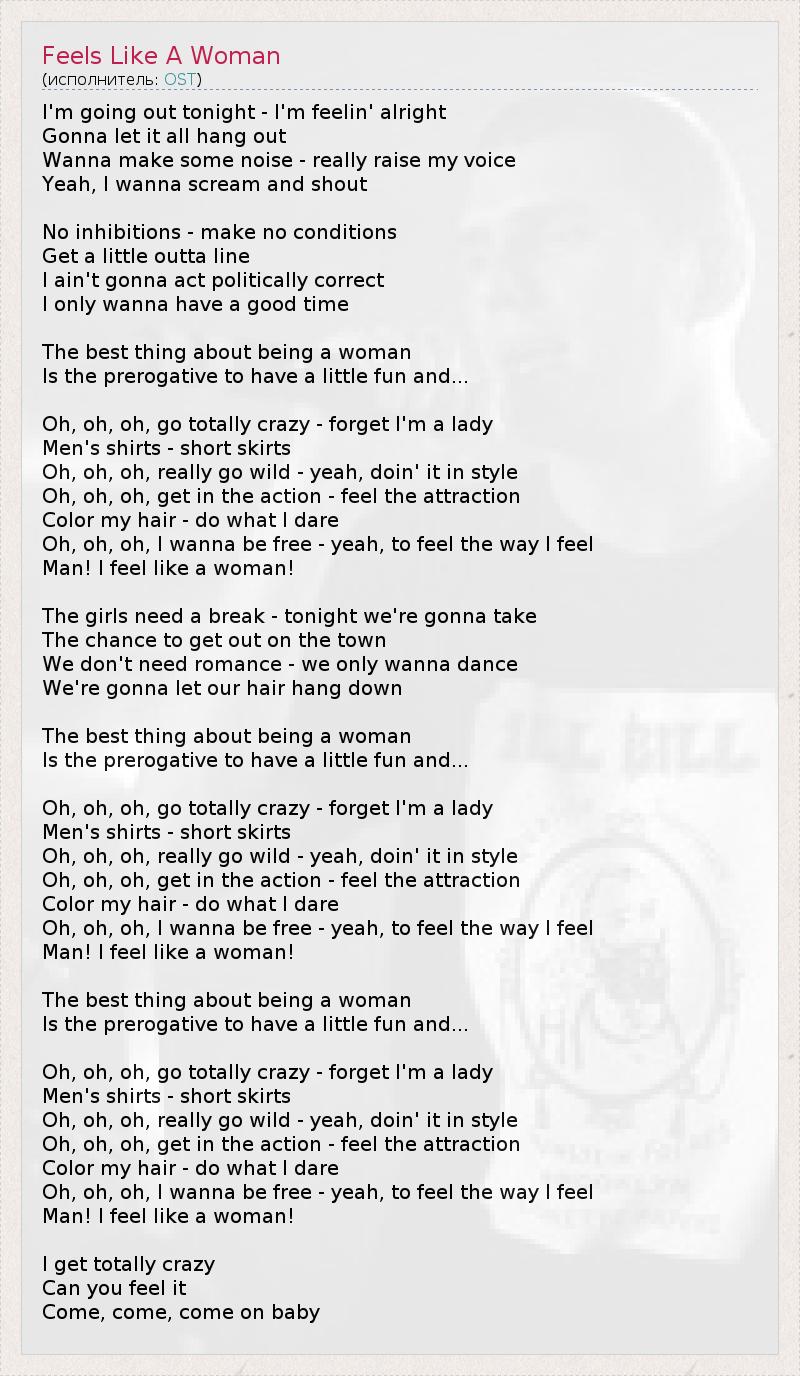 I'm going out tonight - I'm feelin' alright Gonna let it all hang out Wanna make some noise - really raise my voice Yeah, I wanna scream and shout No inhibitions - make no conditions Get a little outta line I ain't gonna act politically correct I only wanna have a good time The best thing about being a woman Is the prerogative to have a little fun and... Oh, oh, oh, go totally crazy - forget I'm a lady Men's shirts - short skirts Oh, oh, oh, really go wild - yeah, doin' it in style Oh, oh, oh, get in the action - feel the attraction Color my hair - do what I dare Oh, oh, oh, I wanna be free - yeah, to feel the way I feel Man! I feel like a woman! The girls need a break - tonight we're gonna take The chance to get out on the town We don't need romance - we only wanna dance We're gonna let our hair hang down The best thing about being a woman Is the prerogative to have a little fun and... Oh, oh, oh, go totally crazy - forget I'm a lady Men's shirts - short skirts Oh, oh, oh, really go wild - yeah, doin' it in style Oh, oh, oh, get in the action - feel the attraction Color my hair - do what I dare Oh, oh, oh, I wanna be free - yeah, to feel the way I feel Man! I feel like a woman! The best thing about being a woman Is the prerogative to have a little fun and... Oh, oh, oh, go totally crazy - forget I'm a lady Men's shirts - short skirts Oh, oh, oh, really go wild - yeah, doin' it in style Oh, oh, oh, get in the action - feel the attraction Color my hair - do what I dare Oh, oh, oh, I wanna be free - yeah, to feel the way I feel Man! I feel like a woman! I get totally crazy Can you feel it Come, come, come on baby