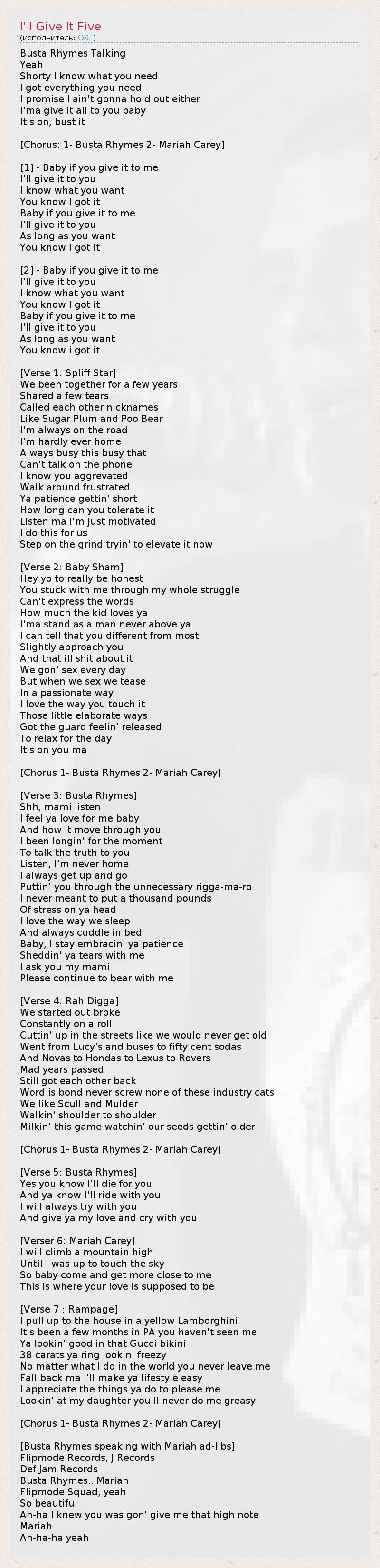 Busta Rhymes Talking Yeah Shorty I know what you need I got everything you need I promise I ain't gonna hold out either I'ma give it all to you baby It's on, bust it [Chorus: 1- Busta Rhymes 2- Mariah Carey] [1] - Baby if you give it to me I'll give it to you I know what you want You know I got it Baby if you give it to me I'll give it to you As long as you want You know i got it [2] - Baby if you give it to me I'll give it to you I know what you want You know I got it Baby if you give it to me I'll give it to you As long as you want You know i got it [Verse 1: Spliff Star] We been together for a few years Shared a few tears Called each other nicknames Like Sugar Plum and Poo Bear I'm always on the road I'm hardly ever home Always busy this busy that Can't talk on the phone I know you aggrevated Walk around frustrated Ya patience gettin' short How long can you tolerate it Listen ma I'm just motivated I do this for us Step on the grind tryin' to elevate it now [Verse 2: Baby Sham] Hey yo to really be honest You stuck with me through my whole struggle Can't express the words How much the kid loves ya I'ma stand as a man never above ya I can tell that you different from most Slightly approach you And that ill shit about it We gon' sex every day But when we sex we tease In a passionate way I love the way you touch it Those little elaborate ways Got the guard feelin' released To relax for the day It's on you ma [Chorus 1- Busta Rhymes 2- Mariah Carey] [Verse 3: Busta Rhymes] Shh, mami listen I feel ya love for me baby And how it move through you I been longin' for the moment To talk the truth to you Listen, I'm never home I always get up and go Puttin' you through the unnecessary rigga-ma-ro I never meant to put a thousand pounds Of stress on ya head I love the way we sleep And always cuddle in bed Baby, I stay embracin' ya patience Sheddin' ya tears with me I ask you my mami Please continue to bear with me [Verse 4: Rah Digga] We started out broke Constantly on a roll Cuttin' up in the streets like we would never get old Went from Lucy's and buses to fifty cent sodas And Novas to Hondas to Lexus to Rovers Mad years passed Still got each other back Word is bond never screw none of these industry cats We like Scull and Mulder Walkin' shoulder to shoulder Milkin' this game watchin' our seeds gettin' older [Chorus 1- Busta Rhymes 2- Mariah Carey] [Verse 5: Busta Rhymes] Yes you know I'll die for you And ya know I'll ride with you I will always try with you And give ya my love and cry with you [Verser 6: Mariah Carey] I will climb a mountain high Until I was up to touch the sky So baby come and get more close to me This is where your love is supposed to be [Verse 7 : Rampage] I pull up to the house in a yellow Lamborghini It's been a few months in PA you haven't seen me Ya lookin' good in that Gucci bikini 38 carats ya ring lookin' freezy No matter what I do in the world you never leave me Fall back ma I'll make ya lifestyle easy I appreciate the things ya do to please me Lookin' at my daughter you'll never do me greasy [Chorus 1- Busta Rhymes 2- Mariah Carey] [Busta Rhymes speaking with Mariah ad-libs] Flipmode Records, J Records Def Jam Records Busta Rhymes...Mariah Flipmode Squad, yeah So beautiful Ah-ha I knew you was gon' give me that high note Mariah Ah-ha-ha yeah