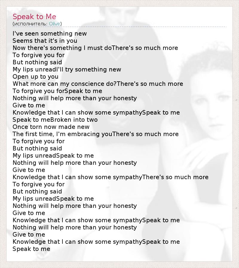I've seen something new Seems that it's in you Now there's something I must doThere's so much more To forgive you for But nothing said My lips unreadI'll try something new Open up to you What more can my conscience do?There's so much more To forgive you forSpeak to me Nothing will help more than your honesty Give to me Knowledge that I can show some sympathySpeak to me Speak to meBroken into two Once torn now made new The first time, I'm embracing youThere's so much more To forgive you for But nothing said My lips unreadSpeak to me Nothing will help more than your honesty Give to me Knowledge that I can show some sympathyThere's so much more To forgive you for But nothing said My lips unreadSpeak to me Nothing will help more than your honesty Give to me Knowledge that I can show some sympathySpeak to me Nothing will help more than your honesty Give to me Knowledge that I can show some sympathySpeak to me Speak to me