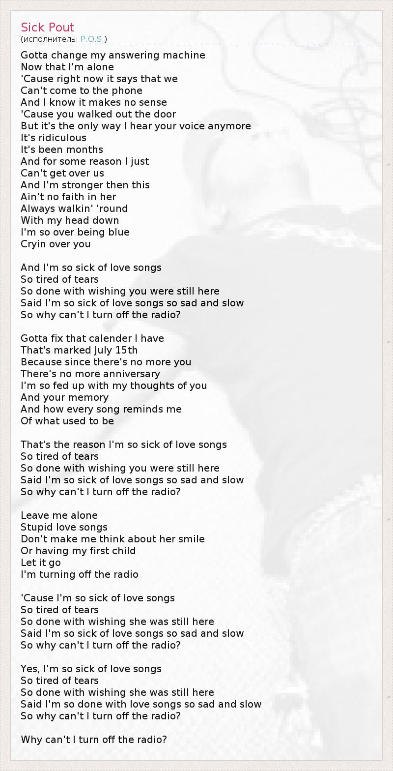 Я должен сменить свой автоответчик Сейчас, потому что я один, Потому что сейчас он говорит, что мы Не можем подойти к телефону. И я знаю, что это не важно, Потому что ты ушла, Но это единственный способ не слышать твой голос. Это так нелепо. Это продолжалось месяцы, И по некоторым причинам я просто Не могу обманывать нас. И я сильнее, чем это. Не веря ей, Всегда следя С понурой головой. Я чрезмерно грустил, Плача над тобой. И я так устал от песен о любви, Так устал от слёз, Так устал желать твоего присутствия здесь . Говорю же, я так устал от песен о любви, таких грустных и медленных, Так почему же я не могу выключить радио? Я должен расправиться с моим календарём: На нем отмечено 15 июля, Потому что с тех пор, как нет тебя, Нет и праздников. Я сыт по горло своими мыслями о тебе И воспоминаниями о тебе, И тем, как каждая песня напоминает мне О том, к чему я привык. И я так устал от песен о любви, Так устал от слёз, Так устал желать твоего присутствия здесь . Говорю же, я так устал от песен о любви, таких грустных и медленных, Так почему же я не могу выключить радио? Оставь меня, Дурацкая любовная песня. Не заставляй меня думать о её улыбке Или о том, чтобы иметь с ней ребёнка. Забудь об этом! Я выключаю радио. И я так устал от песен о любви, Так устал от слёз, Так устал желать твоего присутствия здесь . Говорю же, я так устал от песен о любви, таких грустных и медленных, Так почему же я не могу выключить радио? Да, я так устал от песен о любви, Так устал от слёз, Так устал желать твоего присутствия здесь . Говорю же, я так устал от песен о любви, таких грустных и медленных, Так почему же я не могу выключить радио? Так почему же я не могу выключить радио?