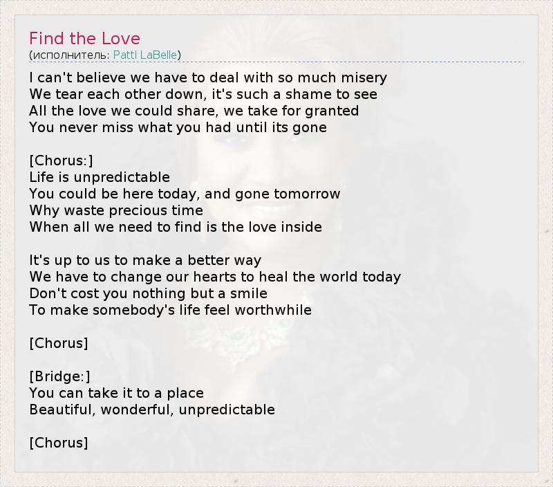 I can't believe we have to deal with so much misery We tear each other down, it's such a shame to see All the love we could share, we take for granted You never miss what you had until its gone [Chorus:] Life is unpredictable You could be here today, and gone tomorrow Why waste precious time When all we need to find is the love inside It's up to us to make a better way We have to change our hearts to heal the world today Don't cost you nothing but a smile To make somebody's life feel worthwhile [Chorus] [Bridge:] You can take it to a place Beautiful, wonderful, unpredictable [Chorus]