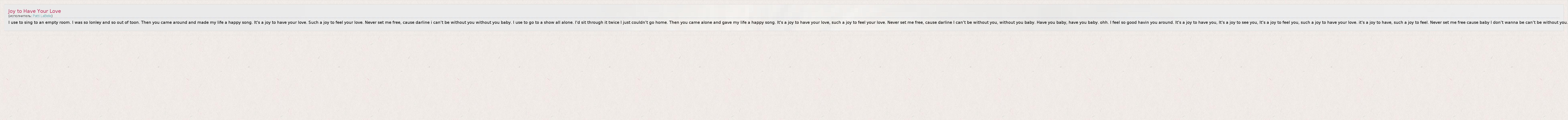 I use to sing to an empty room. I was so lonley and so out of toon. Then you came around and made my life a happy song. It's a joy to have your love. Such a joy to feel your love. Never set me free, cause darline i can't be without you without you baby. I use to go to a show all alone. I'd sit through it twice I just couldn't go home. Then you came alone and gave my life a happy song. It's a joy to have your love, such a joy to feel your love. Never set me free, cause darline I can't be without you, without you baby. Have you baby, have you baby. ohh. I feel so good havin you around. It's a joy to have you, It's a joy to see you, It's a joy to feel you, such a joy to have your love. it's a joy to have, such a joy to feel. Never set me free cause baby I don't wanna be can't be without you.