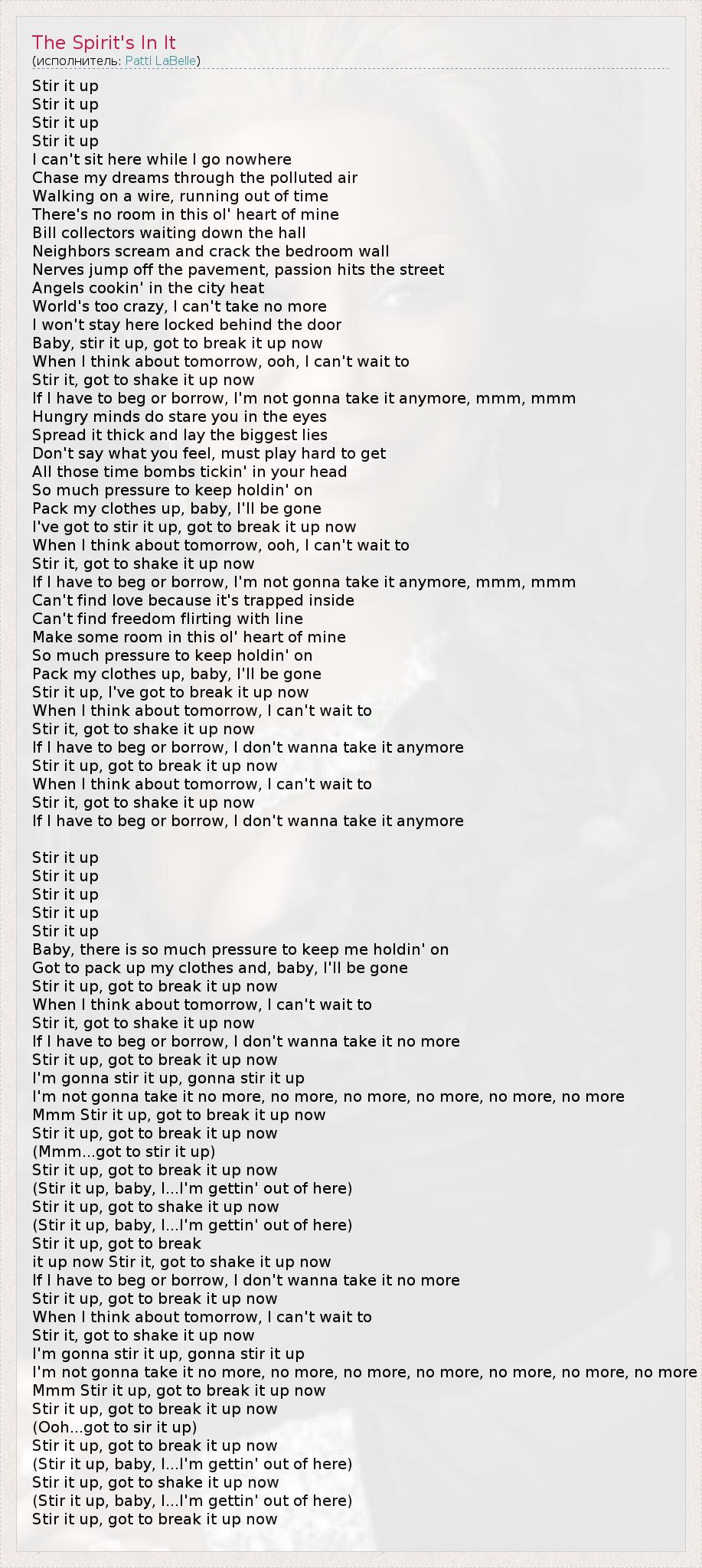 Это интересно:Patti LaBelle (born Patricia Louise Holte; May 24, 1944) is an American singer and actress. She fronted two groups, Patti LaBelle and the Bluebelles, which received minor success on the pop charts in the 1960s, and Labelle, which received acclaim and a mainstream breakthrough in 1974 with their song "Lady Marmalade". She went on to have a solo recording career, earning another U.S. #1 single in 1986 with "On My Own", a duet with Michael McDonald.She is renowned for her passionate stage performances, wide vocal range and distinctive high-octave belting. Her biography, Don't Block the Blessings, remained at the top of The New York... продолжение