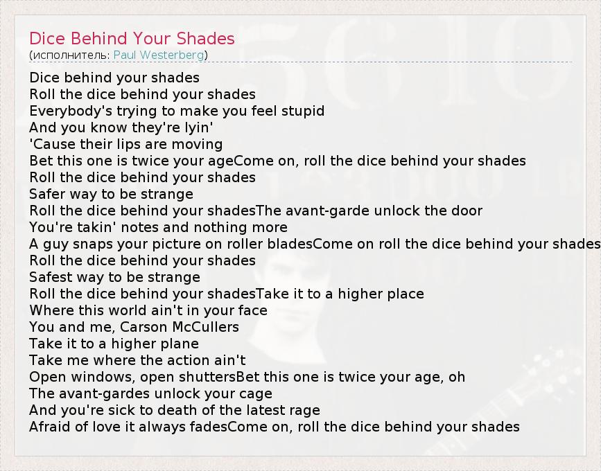 Dice behind your shades Roll the dice behind your shades Everybody's trying to make you feel stupid And you know they're lyin' 'Cause their lips are moving Bet this one is twice your ageCome on, roll the dice behind your shades Roll the dice behind your shades Safer way to be strange Roll the dice behind your shadesThe avant-garde unlock the door You're takin' notes and nothing more A guy snaps your picture on roller bladesCome on roll the dice behind your shades Roll the dice behind your shades Safest way to be strange Roll the dice behind your shadesTake it to a higher place Where this world ain't in your face You and me, Carson McCullers Take it to a higher plane Take me where the action ain't Open windows, open shuttersBet this one is twice your age, oh The avant-gardes unlock your cage And you're sick to death of the latest rage Afraid of love it always fadesCome on, roll the dice behind your shades