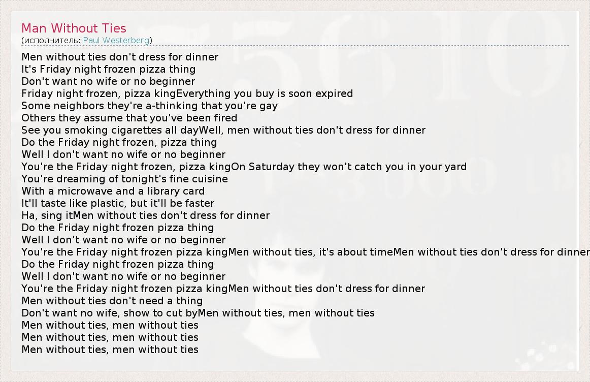 Men without ties don't dress for dinner It's Friday night frozen pizza thing Don't want no wife or no beginner Friday night frozen, pizza kingEverything you buy is soon expired Some neighbors they're a-thinking that you're gay Others they assume that you've been fired See you smoking cigarettes all dayWell, men without ties don't dress for dinner Do the Friday night frozen, pizza thing Well I don't want no wife or no beginner You're the Friday night frozen, pizza kingOn Saturday they won't catch you in your yard You're dreaming of tonight's fine cuisine With a microwave and a library card It'll taste like plastic, but it'll be faster Ha, sing itMen without ties don't dress for dinner Do the Friday night frozen pizza thing Well I don't want no wife or no beginner You're the Friday night frozen pizza kingMen without ties, it's about timeMen without ties don't dress for dinner Do the Friday night frozen pizza thing Well I don't want no wife or no beginner You're the Friday night frozen pizza kingMen without ties don't dress for dinner Men without ties don't need a thing Don't want no wife, show to cut byMen without ties, men without ties Men without ties, men without ties Men without ties, men without ties Men without ties, men without ties