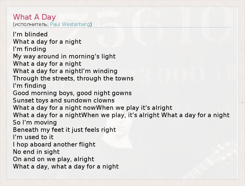 I'm blinded What a day for a night I'm finding My way around in morning's light What a day for a night What a day for a nightI'm winding Through the streets, through the towns I'm finding Good morning boys, good night gowns Sunset toys and sundown clowns What a day for a night nowWhen we play it's alright What a day for a nightWhen we play, it's alright What a day for a night So I'm moving Beneath my feet it just feels right I'm used to it I hop aboard another flight No end in sight On and on we play, alright What a day, what a day for a night