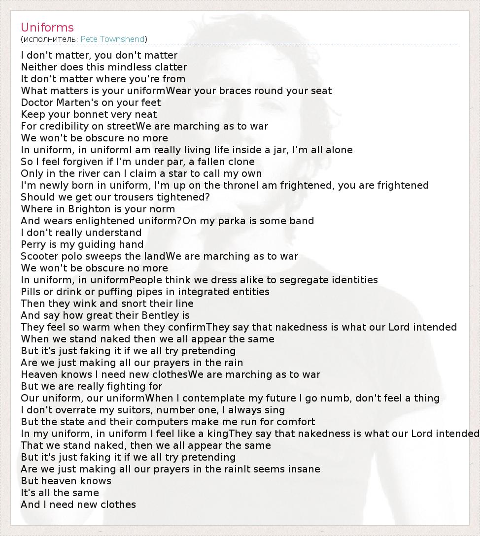 I don't matter, you don't matter Neither does this mindless clatter It don't matter where you're from What matters is your uniformWear your braces round your seat Doctor Marten's on your feet Keep your bonnet very neat For credibility on streetWe are marching as to war We won't be obscure no more In uniform, in uniformI am really living life inside a jar, I'm all alone So I feel forgiven if I'm under par, a fallen clone Only in the river can I claim a star to call my own I'm newly born in uniform, I'm up on the throneI am frightened, you are frightened Should we get our trousers tightened? Where in Brighton is your norm And wears enlightened uniform?On my parka is some band I don't really understand Perry is my guiding hand Scooter polo sweeps the landWe are marching as to war We won't be obscure no more In uniform, in uniformPeople think we dress alike to segregate identities Pills or drink or puffing pipes in integrated entities Then they wink and snort their line And say how great their Bentley is They feel so warm when they confirmThey say that nakedness is what our Lord intended When we stand naked then we all appear the same But it's just faking it if we all try pretending Are we just making all our prayers in the rain Heaven knows I need new clothesWe are marching as to war But we are really fighting for Our uniform, our uniformWhen I contemplate my future I go numb, don't feel a thing I don't overrate my suitors, number one, I always sing But the state and their computers make me run for comfort In my uniform, in uniform I feel like a kingThey say that nakedness is what our Lord intended That we stand naked, then we all appear the same But it's just faking it if we all try pretending Are we just making all our prayers in the rainIt seems insane But heaven knows It's all the same And I need new clothes