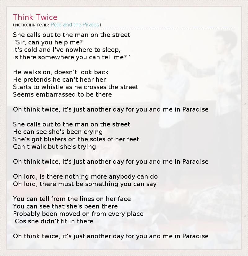 Она обращается к прохожему на улице: "Сэр, вы не могли бы мне помочь? Здесь холодно, а мне негде остановиться на ночлег, Не подскажите ли мне, куда я могу пойти?.." Он продолжает идти, не оглядываясь, Притворяется, что не слышит её. Переходя на другую сторону улицы, начал что-то насвистывать, Чтобы скрыть смущение. О, подумай дважды, ведь это просто ещё один день в раю для нас с тобой. Она обращается к прохожему на улице, Он видит, что она плакала. Её ноги в мозолях, Она уже не может идти, но всё равно старается... О, подумай дважды, ведь это просто один лишний день в раю для нас с тобой. О, Всевышний, неужели никто ничего не сможет изменить? О, Всевышний, неужели тебе нечего сказать? На её лице можно было прочесть, Через что она прошла за свою жизнь. Наверное, её прогоняли везде, Нигде не находилось ей места. О, подумай дважды, ведь это просто ещё один лишний день в раю для нас с тобой.