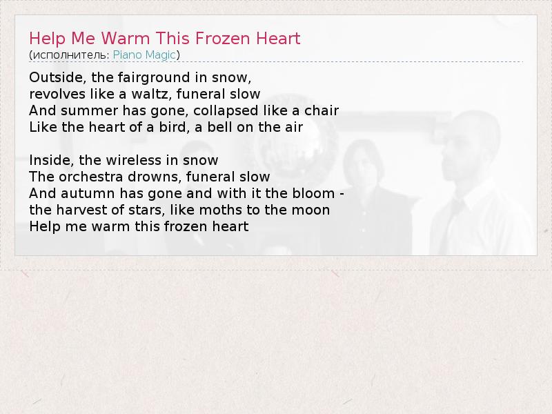 ГлавнаяИсполнителиPiano MagicHelp Me Warm This Frozen Heart