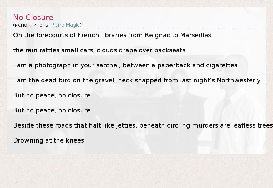 Это интересно:Бытует мнение, что PM играют пост-рок. Что ж, раз ярлык необходим, то лучше этот, чем нечто вроде "avant-garde ambient gothic-influenced post-rock". И все же сам термин пост-рок сейчас, после того как стиль прошел свой пик, невероятно "разбух": сюда относят музыку от Dif Juz (незаслуженно забытых родоначальников, и это - еще в 1981-м!) через Labradford, Low, Godspeed You!Black Emperor (и прочих - весьма разноплановых - коллективов... продолжение