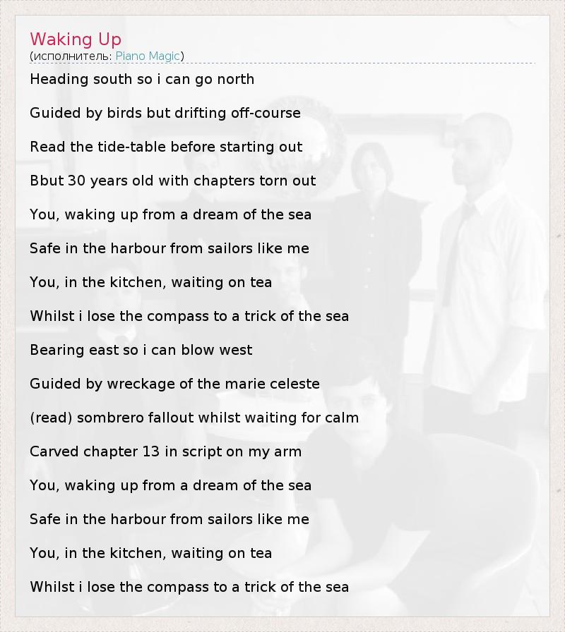 Heading south so i can go north Guided by birds but drifting off-course Read the tide-table before starting out Bbut 30 years old with chapters torn out You, waking up from a dream of the sea Safe in the harbour from sailors like me You, in the kitchen, waiting on tea Whilst i lose the compass to a trick of the sea Bearing east so i can blow west Guided by wreckage of the marie celeste (read) sombrero fallout whilst waiting for calm Carved chapter 13 in script on my arm You, waking up from a dream of the sea Safe in the harbour from sailors like me You, in the kitchen, waiting on tea Whilst i lose the compass to a trick of the sea
