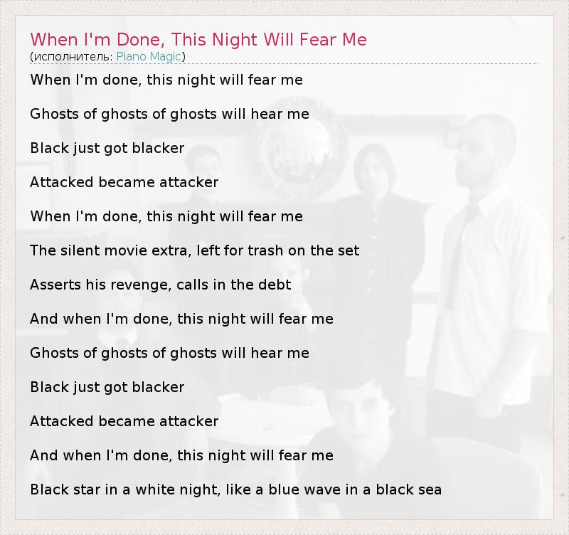 When I'm done, this night will fear me Ghosts of ghosts of ghosts will hear me Black just got blacker Attacked became attacker When I'm done, this night will fear me The silent movie extra, left for trash on the set Asserts his revenge, calls in the debt And when I'm done, this night will fear me Ghosts of ghosts of ghosts will hear me Black just got blacker Attacked became attacker And when I'm done, this night will fear me Black star in a white night, like a blue wave in a black sea
