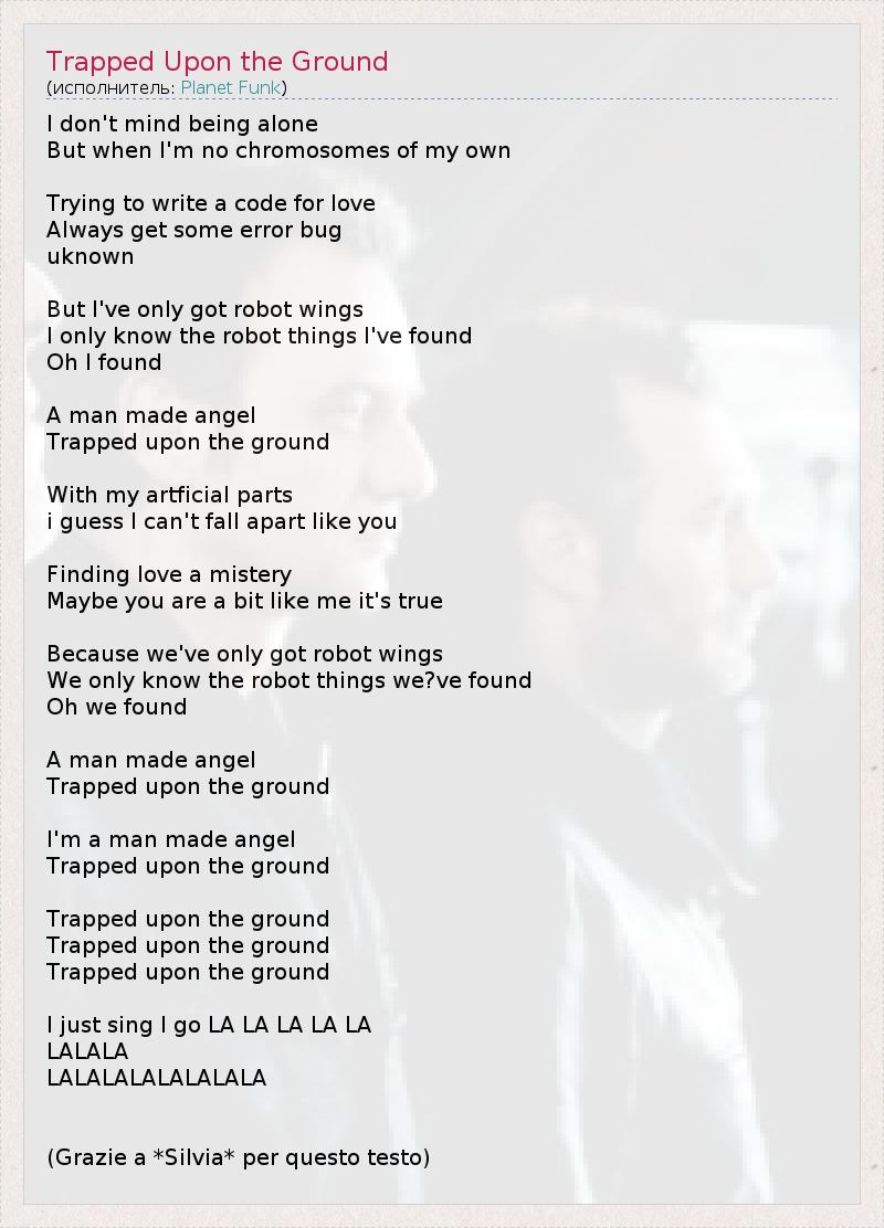 I don't mind being alone But when I'm no chromosomes of my own Trying to write a code for love Always get some error bug uknown But I've only got robot wings I only know the robot things I've found Oh I found A man made angel Trapped upon the ground With my artficial parts i guess I can't fall apart like you Finding love a mistery Maybe you are a bit like me it's true Because we've only got robot wings We only know the robot things we?ve found Oh we found A man made angel Trapped upon the ground I'm a man made angel Trapped upon the ground Trapped upon the ground Trapped upon the ground Trapped upon the ground I just sing I go LA LA LA LA LA LALALA LALALALALALALALA (Grazie a *Silvia* per questo testo)
