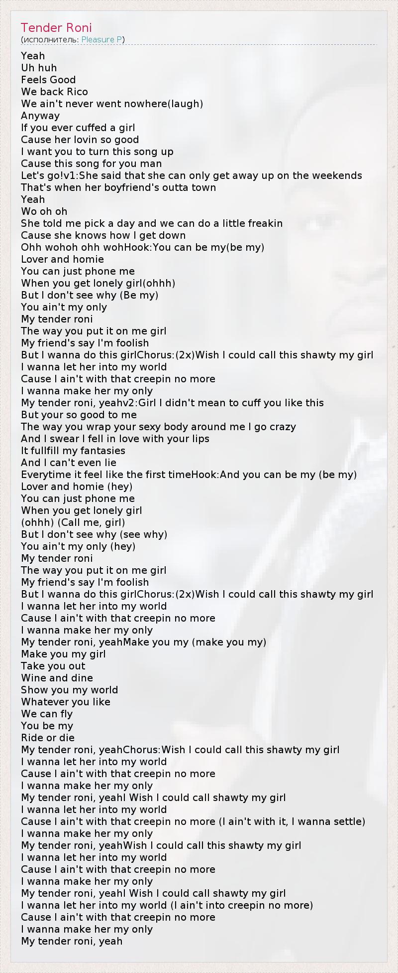 Yeah Uh huh Feels Good We back Rico We ain't never went nowhere(laugh) Anyway If you ever cuffed a girl Cause her lovin so good I want you to turn this song up Cause this song for you man Let's go!v1:She said that she can only get away up on the weekends That's when her boyfriend's outta town Yeah Wo oh oh She told me pick a day and we can do a little freakin Cause she knows how I get down Ohh wohoh ohh wohHook:You can be my(be my) Lover and homie You can just phone me When you get lonely girl(ohhh) But I don't see why (Be my) You ain't my only My tender roni The way you put it on me girl My friend's say I'm foolish But I wanna do this girlChorus:(2x)Wish I could call this shawty my girl I wanna let her into my world Cause I ain't with that creepin no more I wanna make her my only My tender roni, yeahv2:Girl I didn't mean to cuff you like this But your so good to me The way you wrap your sexy body around me I go crazy And I swear I fell in love with your lips It fullfill my fantasies And I can't even lie Everytime it feel like the first timeHook:And you can be my (be my) Lover and homie (hey) You can just phone me When you get lonely girl (ohhh) (Call me, girl) But I don't see why (see why) You ain't my only (hey) My tender roni The way you put it on me girl My friend's say I'm foolish But I wanna do this girlChorus:(2x)Wish I could call this shawty my girl I wanna let her into my world Cause I ain't with that creepin no more I wanna make her my only My tender roni, yeahMake you my (make you my) Make you my girl Take you out Wine and dine Show you my world Whatever you like We can fly You be my Ride or die My tender roni, yeahChorus:Wish I could call this shawty my girl I wanna let her into my world Cause I ain't with that creepin no more I wanna make her my only My tender roni, yeahI Wish I could call shawty my girl I wanna let her into my world Cause I ain't with that creepin no more (I ain't with it, I wanna settle) I wanna make her my only My tender roni, yeahWish I could call this shawty my girl I wanna let her into my world Cause I ain't with that creepin no more I wanna make her my only My tender roni, yeahI Wish I could call shawty my girl I wanna let her into my world (I ain't into creepin no more) Cause I ain't with that creepin no more I wanna make her my only My tender roni, yeah