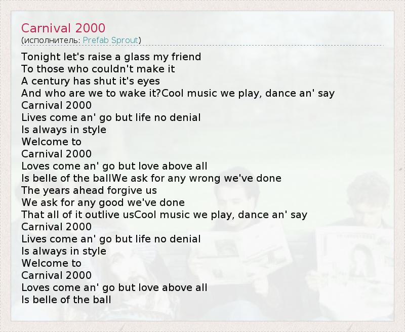 Tonight let's raise a glass my friend To those who couldn't make it A century has shut it's eyes And who are we to wake it?Cool music we play, dance an' say Carnival 2000 Lives come an' go but life no denial Is always in style Welcome to Carnival 2000 Loves come an' go but love above all Is belle of the ballWe ask for any wrong we've done The years ahead forgive us We ask for any good we've done That all of it outlive usCool music we play, dance an' say Carnival 2000 Lives come an' go but life no denial Is always in style Welcome to Carnival 2000 Loves come an' go but love above all Is belle of the ball