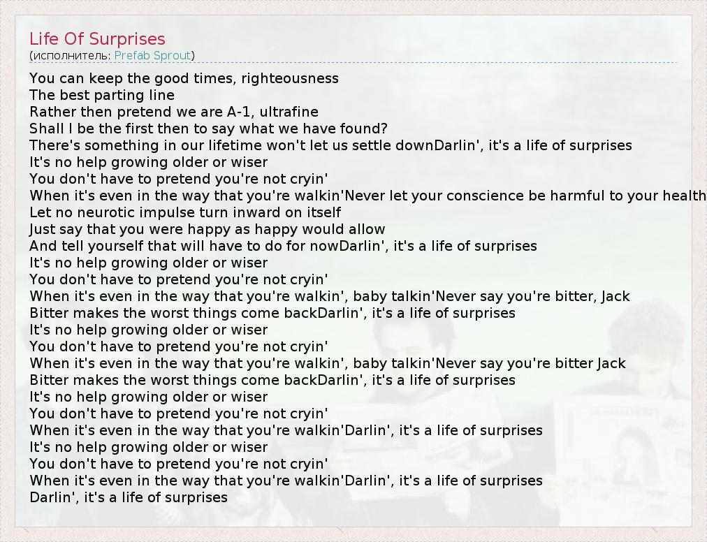 А как ты думаешь, о чем песня "Life Of Surprises" ?