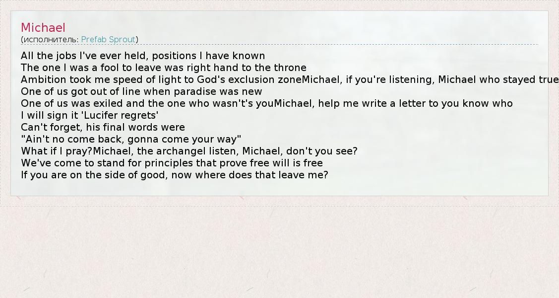All the jobs I've ever held, positions I have known The one I was a fool to leave was right hand to the throne Ambition took me speed of light to God's exclusion zoneMichael, if you're listening, Michael who stayed true One of us got out of line when paradise was new One of us was exiled and the one who wasn't's youMichael, help me write a letter to you know who I will sign it 'Lucifer regrets' Can't forget, his final words were "Ain't no come back, gonna come your way" What if I pray?Michael, the archangel listen, Michael, don't you see? We've come to stand for principles that prove free will is free If you are on the side of good, now where does that leave me?