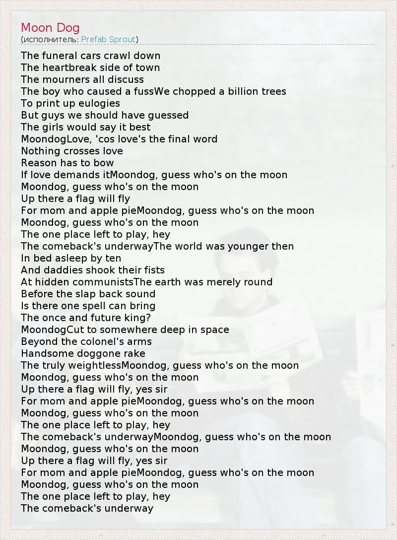 The funeral cars crawl down The heartbreak side of town The mourners all discuss The boy who caused a fussWe chopped a billion trees To print up eulogies But guys we should have guessed The girls would say it best MoondogLove, 'cos love's the final word Nothing crosses love Reason has to bow If love demands itMoondog, guess who's on the moon Moondog, guess who's on the moon Up there a flag will fly For mom and apple pieMoondog, guess who's on the moon Moondog, guess who's on the moon The one place left to play, hey The comeback's underwayThe world was younger then In bed asleep by ten And daddies shook their fists At hidden communistsThe earth was merely round Before the slap back sound Is there one spell can bring The once and future king? MoondogCut to somewhere deep in space Beyond the colonel's arms Handsome doggone rake The truly weightlessMoondog, guess who's on the moon Moondog, guess who's on the moon Up there a flag will fly, yes sir For mom and apple pieMoondog, guess who's on the moon Moondog, guess who's on the moon The one place left to play, hey The comeback's underwayMoondog, guess who's on the moon Moondog, guess who's on the moon Up there a flag will fly, yes sir For mom and apple pieMoondog, guess who's on the moon Moondog, guess who's on the moon The one place left to play, hey The comeback's underway