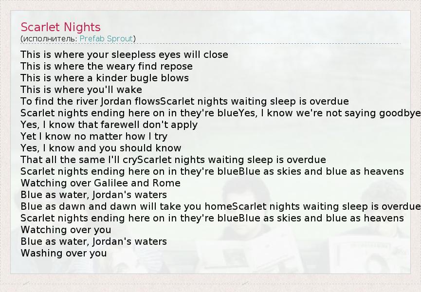 To find the river Jordan flowsScarlet nights waiting sleep is overdue