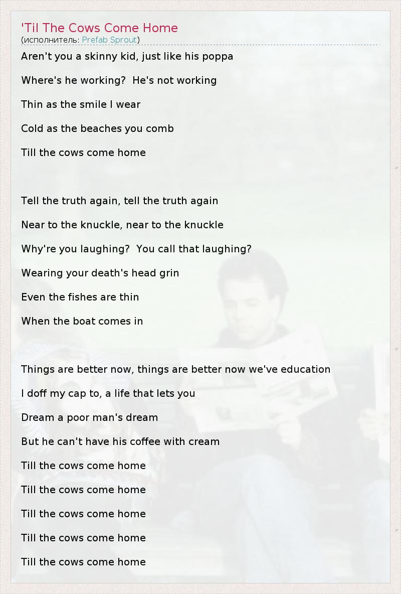 Aren't you a skinny kid, just like his poppa Where's he working? He's not working Thin as the smile I wear Cold as the beaches you comb Till the cows come home Tell the truth again, tell the truth again Near to the knuckle, near to the knuckle Why're you laughing? You call that laughing? Wearing your death's head grin Even the fishes are thin When the boat comes in Things are better now, things are better now we've education I doff my cap to, a life that lets you Dream a poor man's dream But he can't have his coffee with cream Till the cows come home Till the cows come home Till the cows come home Till the cows come home Till the cows come home