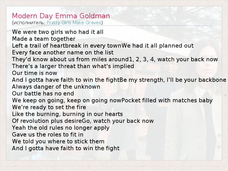 А как ты думаешь, о чем песня "Modern Day Emma Goldman" ?