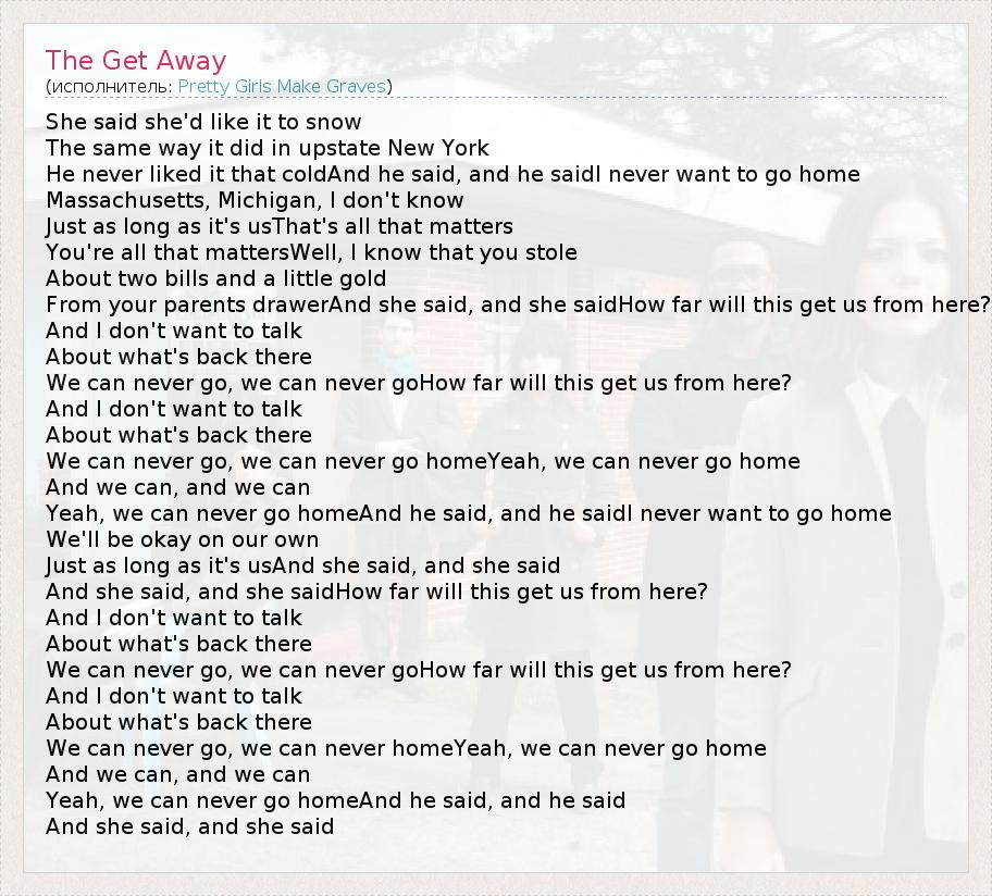 She said she'd like it to snow The same way it did in upstate New York He never liked it that coldAnd he said, and he saidI never want to go home Massachusetts, Michigan, I don't know Just as long as it's usThat's all that matters You're all that mattersWell, I know that you stole About two bills and a little gold From your parents drawerAnd she said, and she saidHow far will this get us from here? And I don't want to talk About what's back there We can never go, we can never goHow far will this get us from here? And I don't want to talk About what's back there We can never go, we can never go homeYeah, we can never go home And we can, and we can Yeah, we can never go homeAnd he said, and he saidI never want to go home We'll be okay on our own Just as long as it's usAnd she said, and she said And she said, and she saidHow far will this get us from here? And I don't want to talk About what's back there We can never go, we can never goHow far will this get us from here? And I don't want to talk About what's back there We can never go, we can never homeYeah, we can never go home And we can, and we can Yeah, we can never go homeAnd he said, and he said And she said, and she said