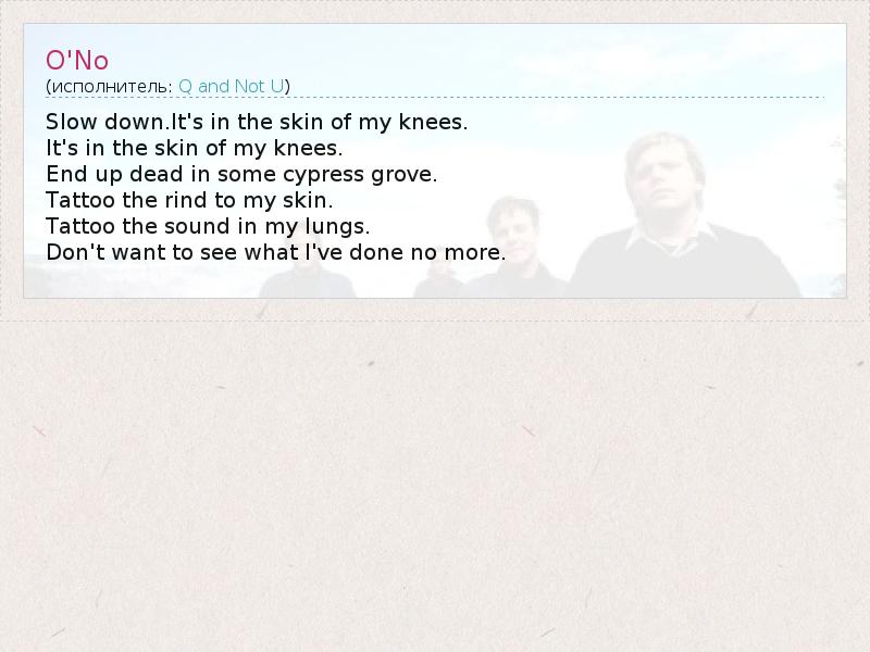 Это интересно:Q and Not U - были пост-хардкор группой из Вашингтона, округ Колумбия, имевшей контракт с Dischord Records. Джон Дэвис, Харрис Клар, Кристофер Ричардс и Мэтт Борлик (участвовал в записи первого альбома группы) основали группу в 1998 году. После ухода Борлика , группа приступила к записи еще двух долгоиграющих пластинок, основанных на аспекте dance-punk, и других различных музыкальных стилей. Q and Not U окончательно... продолжение