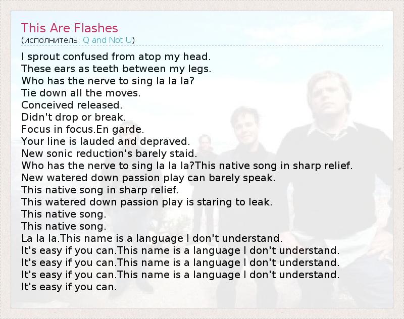 Это интересно:Q and Not U - были пост-хардкор группой из Вашингтона, округ Колумбия, имевшей контракт с Dischord Records. Джон Дэвис, Харрис Клар, Кристофер Ричардс и Мэтт Борлик (участвовал в записи первого альбома группы) основали группу в 1998 году. После ухода Борлика , группа приступила к записи еще двух долгоиграющих пластинок, основанных на аспекте dance-punk, и других различных музыкальных стилей. Q and Not U окончательно... продолжение
