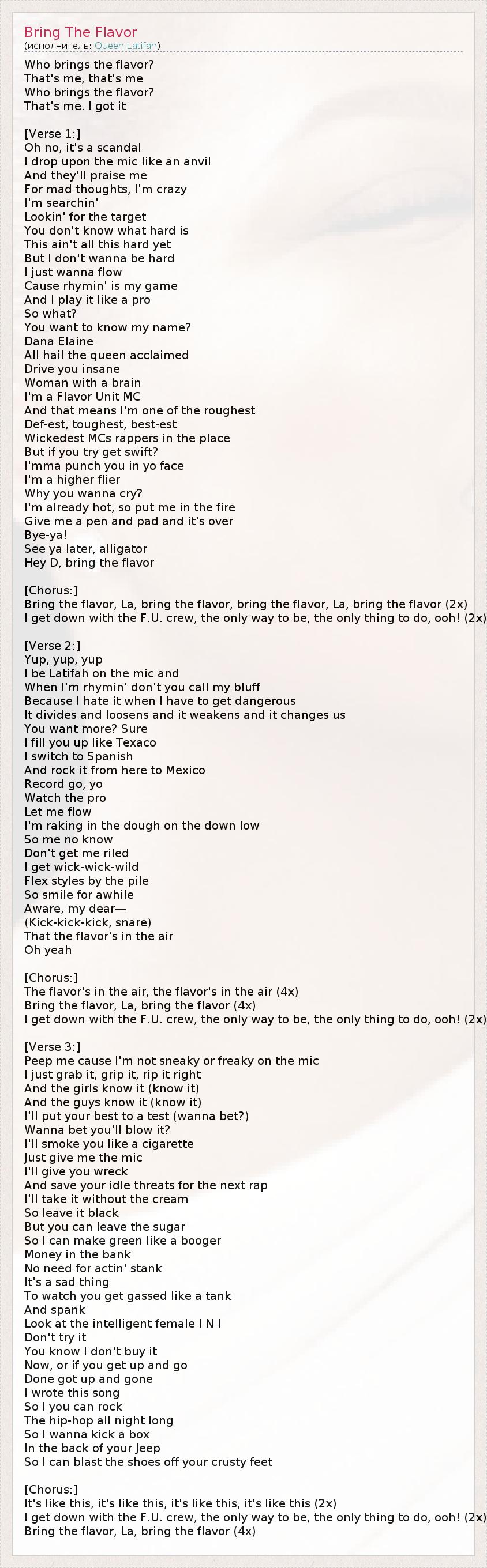 Who brings the flavor? That's me, that's me Who brings the flavor? That's me. I got it [Verse 1:] Oh no, it's a scandal I drop upon the mic like an anvil And they'll praise me For mad thoughts, I'm crazy I'm searchin' Lookin' for the target You don't know what hard is This ain't all this hard yet But I don't wanna be hard I just wanna flow Cause rhymin' is my game And I play it like a pro So what? You want to know my name? Dana Elaine All hail the queen acclaimed Drive you insane Woman with a brain I'm a Flavor Unit MC And that means I'm one of the roughest Def-est, toughest, best-est Wickedest MCs rappers in the place But if you try get swift? I'mma punch you in yo face I'm a higher flier Why you wanna cry? I'm already hot, so put me in the fire Give me a pen and pad and it's over Bye-ya! See ya later, alligator Hey D, bring the flavor [Chorus:] Bring the flavor, La, bring the flavor, bring the flavor, La, bring the flavor (2x) I get down with the F.U. crew, the only way to be, the only thing to do, ooh! (2x) [Verse 2:] Yup, yup, yup I be Latifah on the mic and When I'm rhymin' don't you call my bluff Because I hate it when I have to get dangerous It divides and loosens and it weakens and it changes us You want more? Sure I fill you up like Texaco I switch to Spanish And rock it from here to Mexico Record go, yo Watch the pro Let me flow I'm raking in the dough on the down low So me no know Don't get me riled I get wick-wick-wild Flex styles by the pile So smile for awhile Aware, my dear— (Kick-kick-kick, snare) That the flavor's in the air Oh yeah [Chorus:] The flavor's in the air, the flavor's in the air (4x) Bring the flavor, La, bring the flavor (4x) I get down with the F.U. crew, the only way to be, the only thing to do, ooh! (2x) [Verse 3:] Peep me cause I'm not sneaky or freaky on the mic I just grab it, grip it, rip it right And the girls know it (know it) And the guys know it (know it) I'll put your best to a test (wanna bet?) Wanna bet you'll blow it? I'll smoke you like a cigarette Just give me the mic I'll give you wreck And save your idle threats for the next rap I'll take it without the cream So leave it black But you can leave the sugar So I can make green like a booger Money in the bank No need for actin' stank It's a sad thing To watch you get gassed like a tank And spank Look at the intelligent female I N I Don't try it You know I don't buy it Now, or if you get up and go Done got up and gone I wrote this song So I you can rock The hip-hop all night long So I wanna kick a box In the back of your Jeep So I can blast the shoes off your crusty feet [Chorus:] It's like this, it's like this, it's like this, it's like this (2x) I get down with the F.U. crew, the only way to be, the only thing to do, ooh! (2x) Bring the flavor, La, bring the flavor (4x)