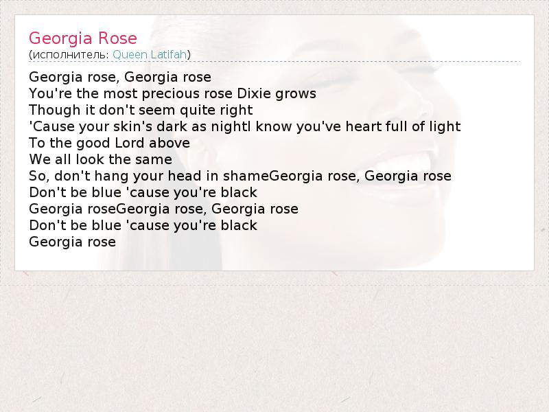 Georgia rose, Georgia rose You're the most precious rose Dixie grows Though it don't seem quite right 'Cause your skin's dark as nightI know you've heart full of light To the good Lord above We all look the same So, don't hang your head in shameGeorgia rose, Georgia rose Don't be blue 'cause you're black Georgia roseGeorgia rose, Georgia rose Don't be blue 'cause you're black Georgia rose