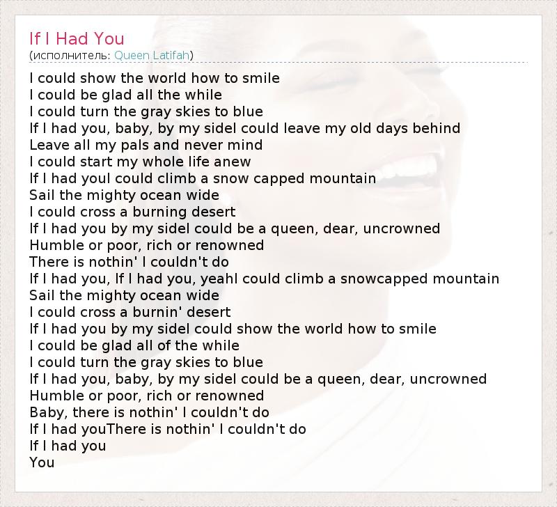 I could show the world how to smile I could be glad all the while I could turn the gray skies to blue If I had you, baby, by my sideI could leave my old days behind Leave all my pals and never mind I could start my whole life anew If I had youI could climb a snow capped mountain Sail the mighty ocean wide I could cross a burning desert If I had you by my sideI could be a queen, dear, uncrowned Humble or poor, rich or renowned There is nothin' I couldn't do If I had you, If I had you, yeahI could climb a snowcapped mountain Sail the mighty ocean wide I could cross a burnin' desert If I had you by my sideI could show the world how to smile I could be glad all of the while I could turn the gray skies to blue If I had you, baby, by my sideI could be a queen, dear, uncrowned Humble or poor, rich or renowned Baby, there is nothin' I couldn't do If I had youThere is nothin' I couldn't do If I had you You