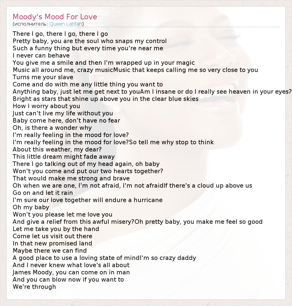 There I go, there I go, there I go Pretty baby, you are the soul who snaps my control Such a funny thing but every time you're near me I never can behave You give me a smile and then I'm wrapped up in your magic Music all around me, crazy musicMusic that keeps calling me so very close to you Turns me your slave Come and do with me any little thing you want to Anything baby, just let me get next to youAm I insane or do I really see heaven in your eyes? Bright as stars that shine up above you in the clear blue skies How I worry about you Just can't live my life without you Baby come here, don't have no fear Oh, is there a wonder why I'm really feeling in the mood for love? I'm really feeling in the mood for love?So tell me why stop to think About this weather, my dear? This little dream might fade away There I go talking out of my head again, oh baby Won't you come and put our two hearts together? That would make me strong and brave Oh when we are one, I'm not afraid, I'm not afraidIf there's a cloud up above us Go on and let it rain I'm sure our love together will endure a hurricane Oh my baby Won't you please let me love you And give a relief from this awful misery?Oh pretty baby, you make me feel so good Let me take you by the hand Come let us visit out there In that new promised land Maybe there we can find A good place to use a loving state of mindI'm so crazy daddy And I never knew what love's all about James Moody, you can come on in man And you can blow now if you want to We're through