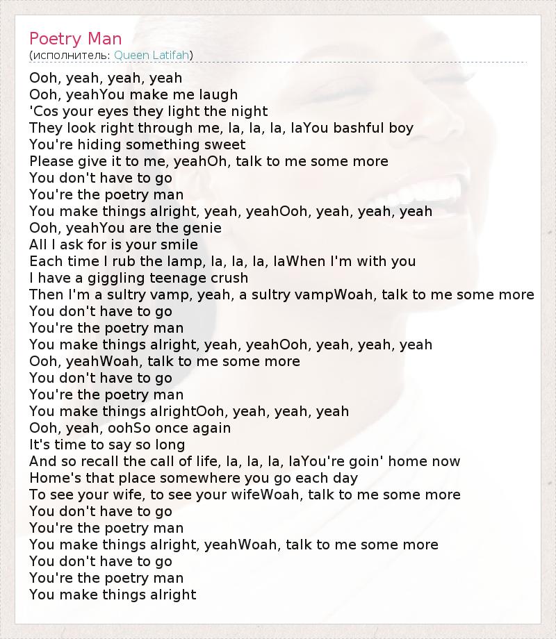 Ooh, yeah, yeah, yeah Ooh, yeahYou make me laugh 'Cos your eyes they light the night They look right through me, la, la, la, laYou bashful boy You're hiding something sweet Please give it to me, yeahOh, talk to me some more You don't have to go You're the poetry man You make things alright, yeah, yeahOoh, yeah, yeah, yeah Ooh, yeahYou are the genie All I ask for is your smile Each time I rub the lamp, la, la, la, laWhen I'm with you I have a giggling teenage crush Then I'm a sultry vamp, yeah, a sultry vampWoah, talk to me some more You don't have to go You're the poetry man You make things alright, yeah, yeahOoh, yeah, yeah, yeah Ooh, yeahWoah, talk to me some more You don't have to go You're the poetry man You make things alrightOoh, yeah, yeah, yeah Ooh, yeah, oohSo once again It's time to say so long And so recall the call of life, la, la, la, laYou're goin' home now Home's that place somewhere you go each day To see your wife, to see your wifeWoah, talk to me some more You don't have to go You're the poetry man You make things alright, yeahWoah, talk to me some more You don't have to go You're the poetry man You make things alright