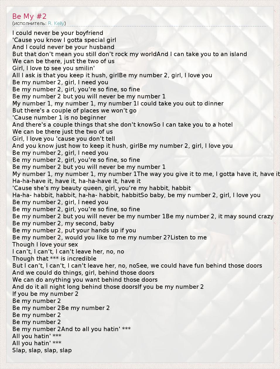 I could never be your boyfriend 'Cause you know I gotta special girl And I could never be your husband But that don't mean you still don't rock my worldAnd I can take you to an island We can be there, just the two of us Girl, I love to see you smilin' All I ask is that you keep it hush, girlBe my number 2, girl, I love you Be my number 2, girl, I need you Be my number 2, girl, you're so fine, so fine Be my number 2 but you will never be my number 1 My number 1, my number 1, my number 1I could take you out to dinner But there's a couple of places we won't go 'Cause number 1 is no beginner And there's a couple things that she don't knowSo I can take you to a hotel We can be there just the two of us Girl, I love you 'cause you don't tell And you know just how to keep it hush, girlBe my number 2, girl, I love you Be my number 2, girl, I need you Be my number 2, girl, you're so fine, so fine Be my number 2 but you will never be my number 1 My number 1, my number 1, my number 1The way you give it to me, I gotta have it, have it Ha-ha-have it, have it, ha-ha-have it, have it 'Cause she's my beauty queen, girl, you're my habbit, habbit Ha-ha- habbit, habbit, ha-ha- habbit, habbitSo baby, be my number 2, girl, I love you Be my number 2, girl, I need you Be my number 2, girl, you're so fine, so fine Be my number 2 but you will never be my number 1Be my number 2, it may sound crazy Be my number 2, my second, baby Be my number 2, put your hands up if you Be my number 2, would you like to me my number 2?Listen to me Though I love your sex I can't, I can't, I can't leave her, no, no Though that *** is incredible But I can't, I can't, I can't leave her, no, noSee, we could have fun behind those doors And we could do things, girl, behind those doors We can do anything you want behind those doors And do it all night long behind those doorsIf you be my number 2 If you be my number 2 Be my number 2 Be my number 2Be my number 2 Be my number 2 Be my number 2 Be my number 2And to all you hatin' *** All you hatin' *** All you hatin' *** Slap, slap, slap, slap